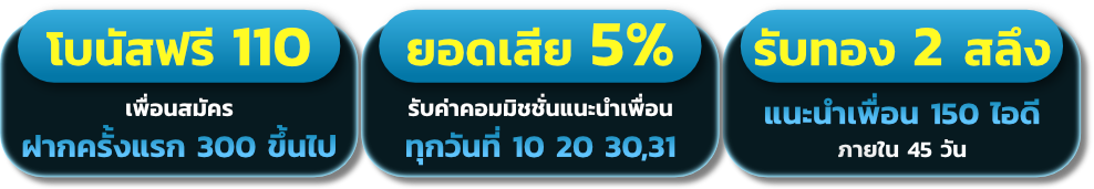 👉 เพื่อนฝากครั้งแรกขั้นต่ำ 300 บาทขึ้นไป ผู้แนะนำจะได้รับโบนัส 100 บาทต่อไอดี (เพื่อนต้องฝากมาภายใน 15 วันหลังจากสมัคร)