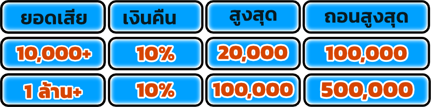 🎉ยอดที่ได้รับคืนสามารถถอนได้ทันที (หากนำไปเล่นต่อต้องทำเทิร์น 1 เท่า เล่นได้ทุกค่ายเกม ถอนได้สูงสุดตามเงื่อนไข)